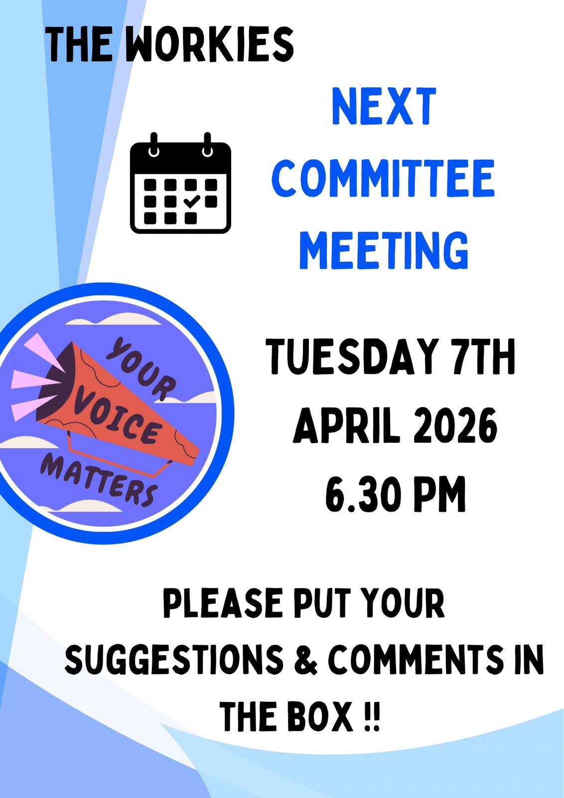 Home Events - Honiton Workies Meetings Committee Meeting Committee Meeting Next Committee Meeting Tuesday 7th April 2026 18:30 Please put your suggestions & comments in the Box! + Add to Google Calendar + iCal / Outlook export 00 days 00 hours 00 minutes 00 seconds Date 07 Apr 2026 Time 18:30 - 20:00 Category Meetings Share this event