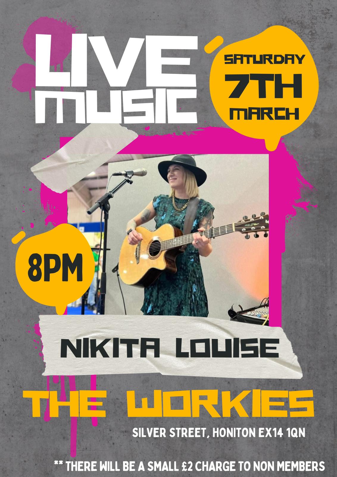 Home Events - Honiton Workies Music Nikita Louise Nikita Louise Nikita Louise Live Saturday 7th March from 8pm There will be a small charge of £2 to non members. + Add to Google Calendar + iCal / Outlook export 00 days 00 hours 00 minutes 00 seconds Tags: Mikita Louise Date 07 Mar 2026 Time 20:00 - 22:30 Category Music Share this event